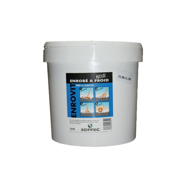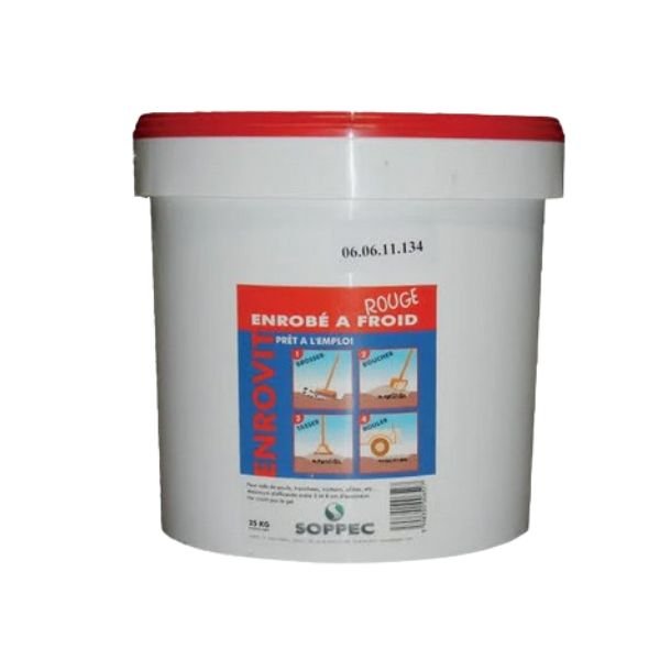 Enrobé stockable conditionné, conçu pour vos utilisations d'urgence (nids de poule, tranchées...)conditionnement garantissant une longue conservation et une disponibilité immédiateenrobés à froid grenu noir ou rouge, souple et drainant (% de vide : 15 à 20 %)granulats et sables conformes aux spécifications de la norme XP P 18-540courbe granulométrique des matériaux discontinue : 0/4, 0/6, 0/10densité : 2consommation : 60 à 80 Kg/m² pour 3 à 5 cm d'épaisseurseau de 25 Kg. [...]